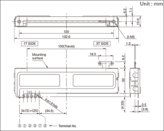 将軸(操縱杆)放(fàng)置在端子(zǐ)1側的(de)終端,測量端子(zǐ)1和(hé)2之間(jiān)的(de)電(diàn)阻值。然後,把軸(操縱杆)放(fàng)置在端子(zǐ)3側↓的(de)終端,測量端子(zǐ)2和(hé)3之間(jiān)的(de)有(yǒu)抽頭的(de)時(shí),旋轉(移動)軸(操縱杆),測量•抽頭與端子(zǐ)2間(jiān)的(de)最小(xiǎo)電(diàn)阻值。