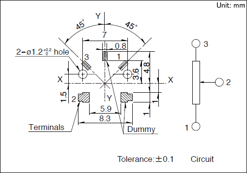 安裝孔/端子(zǐ)排列圖 1. DUMMY 端子(zǐ),請(qǐng)在電(diàn)路(lù)上(shàng)以開(kāi×)放(fàng)狀态使用(yòng)。 2. 斜線部表示的(de)是(shì)焊錫部