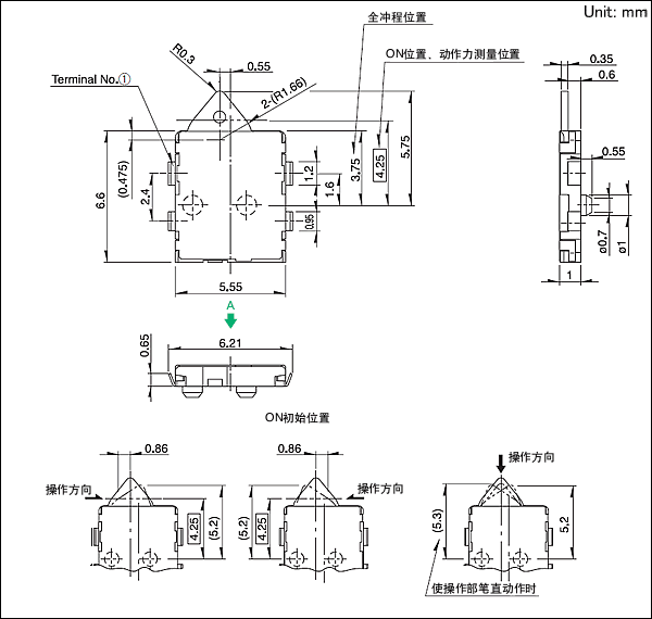 型:卧式 / 薄型多(duō)方向動作(zuò)型 ・ 最大(dà)額定值:1mA 5V DC ・ 動作(zuò)力:0.35N max. ・ 操作(zuò)壽命(無負載):50,000 cy←cles